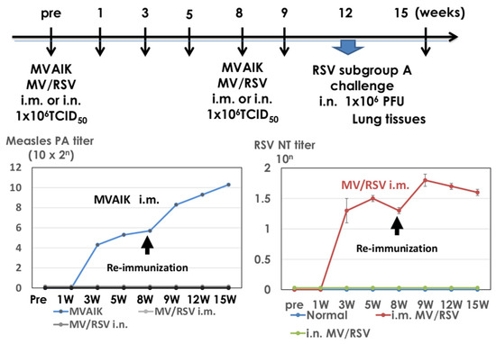 Immunization schedule and antibody responses against measles and RSV. Three cotton rats were immunized with MVAIK and MV/RSV through intra-nasal (i.n.) and intra-muscular (i.m.) routes and were reimmunized at 8 weeks after the first dose. They were challenged with 1 × 106 PFU of the RSV/Long strain 4 weeks after reimmunization. Lung tissues were obtained 4 days after the challenge. Measles PA antibody and RSV NT titers were examined. Immunization experiment was performed in duplicate.