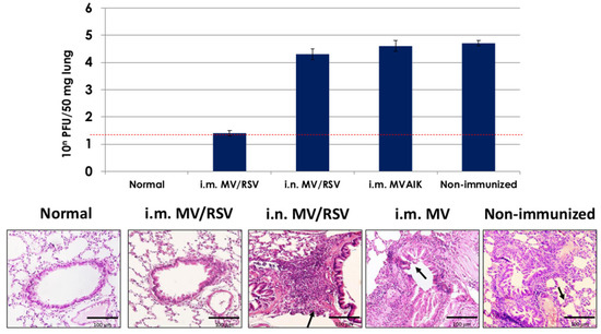 Histopathological findings are shown in the lower panel of Figure 7. No significant pathological finding was noted in cotton rats immunized with chimeric MV/RSV through the i.m. route, like the normal cotton rat. However, destruction of alveolar structures and inflammatory responses were demonstrated in those immunized with MV/RSV through the i.n. route, MVAIK, and non-immunized control: infiltration of inflammatory cells in the peri-bronchus, thickening of the alveolar wall, and swelling of bronchial epithelial cells.