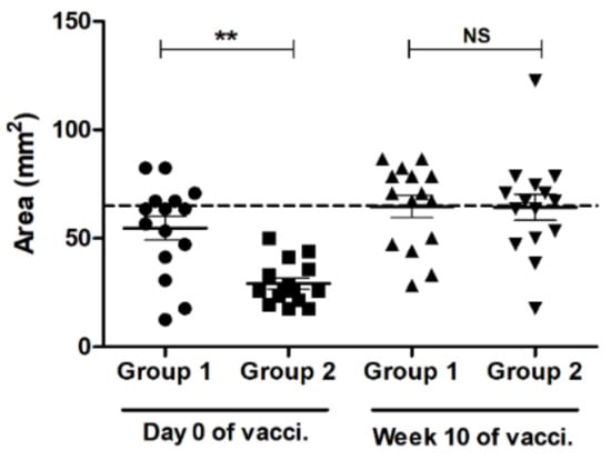 Mean EIV-specific antibody relative concentration determined by single radial hemolysis (SRH) assay. Serum samples were collected from groups 1 (G1) and 2 (G2) after six months of immunization (V1—day 0) with either Calvenza-03 EIV/EHV® (Group 1; G1: black circles) or Fluvac Innovator® (Group 2; G2: black squares) and after 10 weeks (V2—10 weeks) of booster immunization with Calvenza-03 EIV/EHV® for horses of both groups (G1: upright black triangles; G2: downright black triangles). SRH assay was performed as described in the materials and methods. Total area of hemolysis was measured in mm2. The central line in the scattered dot plot indicates the mean of the data with standard error of mean (error bars). ** A significant increase (2-way repeated measures ANOVA with Tukey’s multiple comparisons post-test; p < 0.01) of hemolysis area for group 1 was seen when compared to group 2. NS—not significant; vacci.—vaccination.
