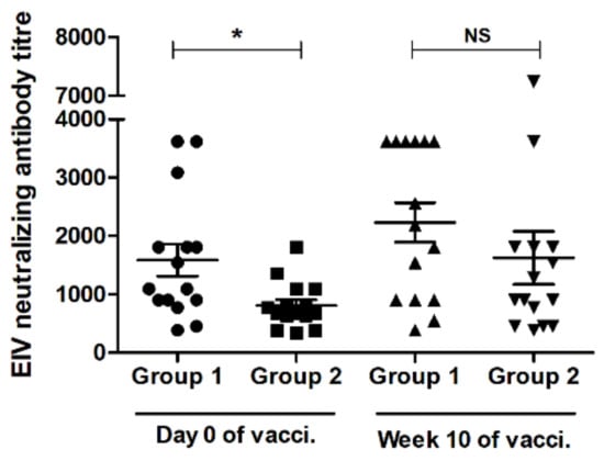 Mean EIV-specific serum neutralizing antibody titers determined by virus neutralization (VN) assay. Serum samples were collected from groups 1 (G1) and 2 (G2) after 6 months of immunization (V1—day 0) with either Calvenza-03 EIV/EHV® (group 1; G1: black circles) or Fluvac Innovator® (group 2; G2: black squares) and after 10 weeks (V2—10 weeks) of booster immunization with Calvenza-03 EIV/EHV® for horses of both groups (G1: upright black triangles; G2: downright black triangles), and VN assay was performed. The central line in the scattered dot plot indicates the mean of the data with standard error of mean (error bars). * A significant increase (2-way repeated measures ANOVA with Tukey’s multiple comparisons post-test; p < 0.05) of antibody titer for group 1 was seen when compared to group 2. NS—not significant; vacci.—vaccination.