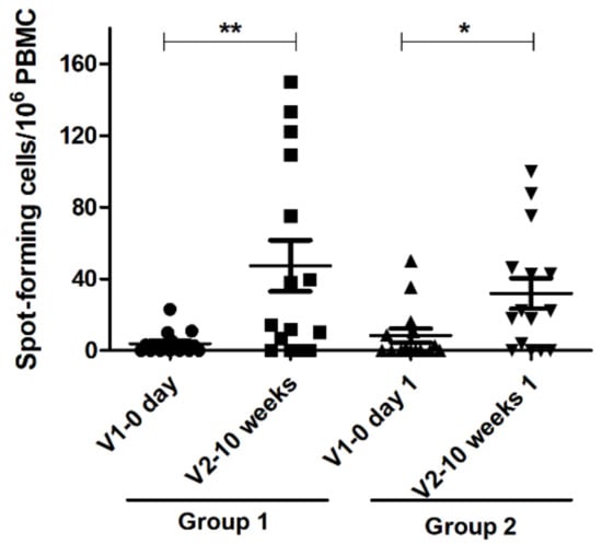ELISpot analysis for interferon gamma (IFN-γ) secreting peripheral blood mononuclear cells (PBMC) from immunized horses. PBMC were collected from G1 and G2 horses before (day 0 = V1; G1: black circles; G2: upright black triangles) and after (10 weeks = V2; G1: black squares; G2: downright black triangle)) booster immunization. PBMC were isolated and stimulated with EIV. The response is presented as IFN-γ positive spot-forming cells per 106 PBMC. The central line in the scattered dot plot indicates the mean of the data with standard error of mean (error bars). * p < 0.05; ** p < 0.01 using 2-way repeated measures ANOVA with Tukey’s multiple comparisons post-test.