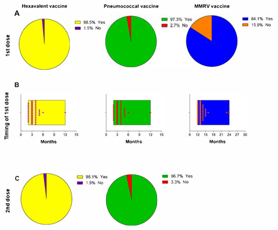 Vaccination status of the children. This panel shows (A) the proportion of children who received the first dose of the Hexavalent, Pneumococcal, and MMRV vaccines; (B) the timing of the receipt of the first dose; and (C) the proportion of children who received the second dose.
