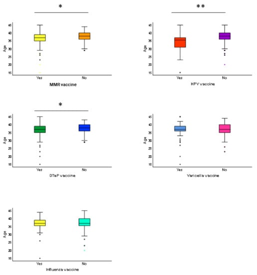 Comparison of age between the vaccinated and non-vaccinated women. These box plots show the distribution of age between the vaccinated and non-vaccinated women. Their age was compared using the Mann–Whitney U test. * p-value < 0.05; ** p-value < 0.01.