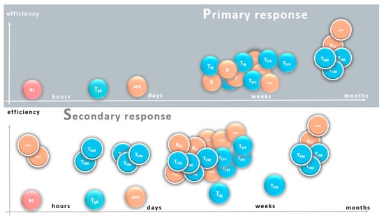anticipatory memory cells that are more sensitive in the detection of specific dangerous targets. These goals are realized by increasing the frequency of antigen specific lymphocyte clones and by the polarization of the response via differentiation of lymphocytes. In the following sections, we briefly summarize the main aspects of trained immunity, but shall focus on the cells that contribute to the lymphocyte-based conventional memory, presenting the role of different B and T cell subsets and emphasizing the differences between the primary and secondary responses.