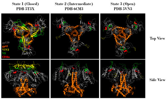 Representative top and side views of Env trimers in state 1 (closed), state 2 (intermediate), and state 3 (open) conformations. Regions corresponding to gp120 (grey), gp41 (orange), V1V2 (yellow), V3 (green), and the CD4 binding site (red) are indicated. Protein Data Bank identifier (PDB ID) numbers are also indicated. Structures adapted from Gristick et al., 2016 [26], Bjorkman et al., 2018 [27], and Ozorowski et al., 2017 [28].