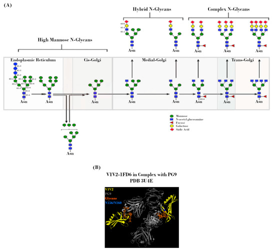 N-linked glycans on the HIV-1 envelope (Env). (A) Potential N-linked glycosylation site (PNGS) occupancy is initiated via the placement of a Glc3Man9GlcNAc2 residue, which is subsequently modified during transit through the endoplasmic reticulum (ER) and Golgi by a milieu of host enzymes to yield its final glycoform. Figure adapted from Jan et al., 2019 [49]. (B) Crystal structure (2.19 Å) of PG9 mAb in complex with V1V2 region from HIV-1. Regions corresponding to V1V2 (yellow), PG9 (grey), PNGS N156 and N160 (blue), and N-glycans (orange) are indicated. Protein Data Bank identifier (PDB ID) number is also indicated. Adapted from McLellan et al., 2011 [50].
