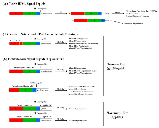 As with all membrane-bound and secreted proteins, the HIV-1 Env contains an N-terminal SP that is responsible for targeting the nascent polypeptide to the ER for processing. In general, SPs consist of an N-terminal hydrophilic positively charged region, a central hydrophobic region responsible for translocation to the ER membrane, and a slightly polar C-terminal region containing a cleavage site (Figure 1, bottom) [104]. The N-terminal region of the HIV-1 SP is relatively unique in that it is both longer and contains more positively charged residues than the average SP [105]. Additionally, the SP remains attached to gp160 until right before it reaches the Golgi, which is also unusual among SPs, most of which are cleaved co-translocationally (Figure 4A) [105,106,107,108].