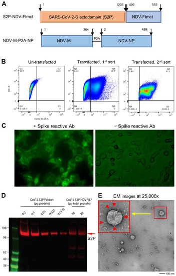 Generation and characterization of SARS-CoV-2 spike membrane-anchored on Newcastle disease virus-like particle (S2P-NDVLP). (A) Schematic construction of S2P-NDVLP-expression plasmids. The top linear diagram shows a S2P-NDV-Ftmct chimeric construct, with the SARS-CoV-2 prefusion-stabilized spike glycoprotein ectodomain (S2P, red) fusing with the NDV fusion protein transmembrane and cytoplasmic tail domain (Ftmct, blue). The bottom linear diagram shows the coexpression construct, the full-length NDV matrix protein (NDV-M, blue) and nucleoprotein (NDV-NP, blue), linked by a self-cleaving peptide (P2A). (B) Generation of the HEK293T cell pool that stably expressed S2P on the cell surface. HEK293T cells were cotransfected with pS2P-NDV-Ftmct and pCMV6-A-puro plasmids. S2P-expressing cells were live immunostained with the anti-SARS-CoV-2 spike-specific neutralizing antibody S652-118 and AF488-conjugated secondary antibody then live sorted using FACS. (C) HEK293T cell pool that stably expressed the S2P glycoprotein on the cell surface was confirmed by live immunostaining with antibody S652-118 (left) and without (right). (D) Immunoblot analysis of S2P-NDVLP with S2P glycoprotein-immunized mouse sera at Week 5 compared with the S2P glycoprotein. See Figure S2 for details on quantification. (E) Structural and morphological characterization of VLPs by transmission electron microscopy. Negative staining showing well-defined S2P-NDVLP (80 nm) with long-length spikes (~17 nm) and short-length spikes protruding at variable angles from the S2P-NDVLP surface (red color arrows in the larger box, top left corner).