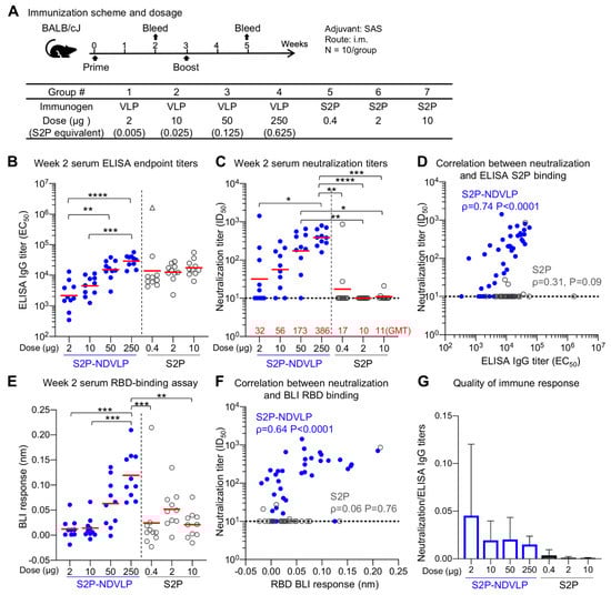 Single immunization of S2P-NDVLP elicited a high immune response against SARS-CoV-2 virus in mice at Week 2. (A) Scheme of the immunization regimen and groups. The control immunogen was a trimeric spike S2P glycoprotein. The amount of S2P in the S2P-NDVLP immunogen was quantified by Western blotting with S2P-immunized mouse sera (see Figure S2). (B) S2P-NDVLP elicited substantial IgG titers against the SARS-CoV-2 spike at Week 2. The endpoint IgG titers were measured, and EC50 values were calculated as the readout for ELISAs with Prism. The triangle symbol indicates the ELISA titer at assay maximum. (C) S2P-NDVLP elicited substantial SARS-CoV-2 pseudovirus neutralization titers at Week 2. Serum-neutralizing antibodies against a D614G pseudovirus were measured, and ID50 values were calculated as the readout of the neutralization assay with Prism. The geometric mean titer (GMT) of each group is marked in red numbers on the horizontal axis. (D) Correlation between neutralization titers and ELISA S2P-specific IgG titers existed in the S2P-NDVLP-immunized groups but not in the S2P-immunized groups. (E) RBD-specific serum antibody titers were measured as BLI responses and calculated with Prism. The titers among the S2P-NDVLP-immunized groups were dose dependent at Week 2. (F) Correlation between neutralization titers and BLI RBD-specific antibody titers existed in the S2P-NDVLP-immunized groups but not in the S2P-immunized groups. (G) Quality of immune responses elicited by immunization was calculated as the ratio of neutralization titer to total ELISA IgG titer, plotted as mean and SD. The horizontal dotted line in (C–F) represents the low detection limit for the neutralization titer. In (B–E), the Kruskal–Wallis test was used to test differences between the groups, and P-values were designated as *: p < 0.05; **: p < 0.01; ***: p < 0.001; ****: p < 0.0001. Geometric means were indicated with a red bar. Spearman correlation was used in (D,F).
