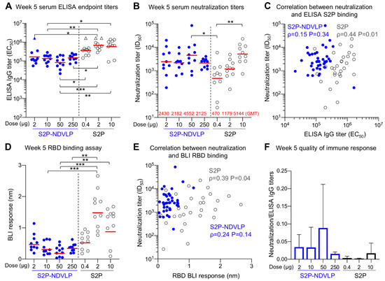 S2P-NDVLP elicited a robust anti-SARS-CoV-2-neutralizing response with a relatively low S2P-equivalent dose in mice at Week 5. (A) Boost immunization elicited higher ELISA titers against the SARS-CoV-2 spike at Week 5. The titers among the S2P-NDVLP-immunized groups were not significantly different. IgG titers in the S2P-immunized groups were significantly higher than the S2P-NDVLP-immunized groups. Triangle symbols indicate the ELISA titers at assay maximum. (B) The S2P-NDVLP groups had robust neutralization activities at Week 5 but were not significantly different from each other. Serum neutralization titers (ID50) were measured against a SARS-CoV-2 D614G variant pseudovirus. (C) Correlation between neutralization titers and ELISA S2P-specific IgG titers did not exist in the S2P-NDVLP-immunized groups, but a weak correlation existed in the S2P-immunized groups. (D) RBD-specific serum antibody titers were measured as BLI responses and calculated with Prism. BLI RBD-specific serum antibody titers in the 2 and 10 μg S2P-immunized groups were significantly higher than all other groups. (E) Correlation between neutralization titer and BLI RBD-specific antibody titer did not exist in the S2P-NDVLP-immunized groups, but a weak correlation existed in the S2P-immunized groups. (F) Quality of the immune responses elicited by immunization was calculated as the ratio of the neutralization titer to the total ELISA IgG titer, plotted as the mean and SD. In (A,B,D), the Kruskal–Wallis test was used to test differences between the groups, and P-values were designated as *: p < 0.05; **: p < 0.01; ***: p < 0.001; ****: p < 0.0001, and geometric mean titers were marked with a red bar. Spearman correlation was used in (C,E).