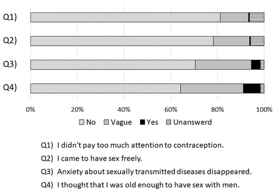 We asked about changes in awareness and actions regarding contraception, free sexual behavior, and sexually transmitted diseases after inoculation (Figure 1). Results showed that those who answered “I didn’t pay too much attention to contraception” or “I came to have sex freely” after vaccination were extremely few (n = 2; 0.5%). There were 16 (3.9%) women who answered “Anxiety about sexually transmitted diseases disappeared,” 30 (7.2%) who answered “I thought that I was old enough to have sex with men,” and over 90% of women who did not observe any obvious changes in awareness of sexual activity following vaccination.
