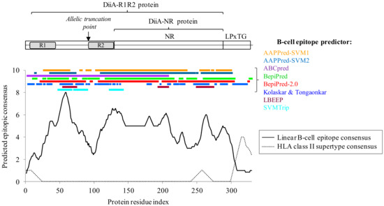 Figure 1. DiiA domain organization and B-cell/HLA class II epitope prediction. The predicted epitope consensus is the resultant of applying a window of seven residues for B-cell epitopes and 15 residues for HLA class II epitopes, their respective average lengths.