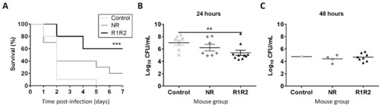 The protective capacity of the immunogenic response induced by the DiiA-based formulations was tested in a murine sepsis model of infection. Pre-immunized mice were challenged with direct intraperitoneal injection of TIGR4 bacteria. After 48h infection, 80% of DiiA−R1R2-immunized mice were alive, in contrast to 10% in control mice. Only 40% mice vaccinated with DiiA−NR version survived at this stage, which was not statistically significant (p = 0.22). The protective reduction observed with DiiA−NR respect to DiiA−R1R2 mirrored the lower immunogenic response that it elicited (Figure 2). Protection was observed even at 168 h (seven days); the fraction of surviving immunized mice was 60% for DiiA−R1R2 and 20% for DiiA−NR proteins, whereas all control mice succumbed to the TIGR4 sepsis infection. Thus, a 60–70% increment in survival rate in sepsis was achieved by utilizing DiiA−R1R2 (Figure 3A).