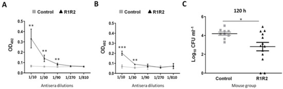 Figure 4. Protection against intranasal colonization. Antibody levels of IgA (A) and total IgG (B) after immunization with control, or DiiA−R1R2 preparations. Data are expressed as the average and standard deviation of triplicate samples. Bacterial load in nasopharyngeal lavage at 120 h post-colonization in groups of at least nine mice. (C). Statistical significance was analyzed by Student’s t-test. * p < 0.05; ** p < 0.01; *** p < 0.001.