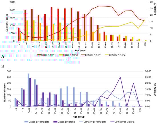 Cases and lethality by age group (2009–2018) and virus type. (A) influenza A; (B) influenza B. The data used in this figure were obtained from Mexico’s influenza surveillance system, SISVEFLU.