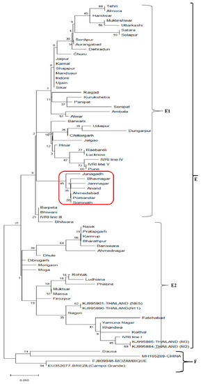 - Anbarasi, P.; Latha, B.R.; Sreekumar, C.; Senthuran, S. Partial sequencing of Bm86 gene for studying the phylogeny of an Indian isolate of Rhipicephalus (Boophilus) microplus tick. J. Parasit. Dis. 2014, 38, 260–264. [Google Scholar] [CrossRef] [PubMed]