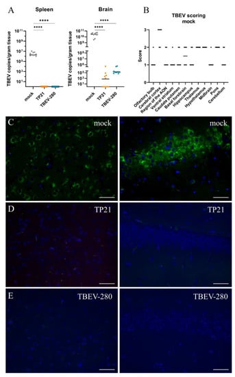 Figure 2. TBEV distribution in the periphery and in the CNS. (A) qPCR analysis of viral RNA isolated from the spleen and brain of mock (▼), TP21 (♦) and TBEV-280 (▲) immunized mice. RNA copies per gram tissue were determined and data obtained from individual mice were plotted, bars indicate median (n = 10; **** p < 0.0001) (B). Tissue sections were stained with antibody targeting TBEV E-protein (green) and Hoechst (nuclei, blue) and virus antigen distribution in brain of mock immunized mice was scored based on the frequency of infected cells in the high power fields (HPF) analyzed (n = 6). Representative immunofluorescence images from cerebral cortex (left panels) and hippocampus (right panels) regions from mock immunized (C), TP21 immunized (D), and TBEV-280 immunized (E) mice infected with TBEV-Hypr are depicted here. Scale bars 50 µm.