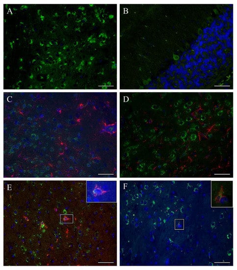 Immunofluorescence staining for TBEV antigen of brain sections from control, TBEV-Hypr-infected mice revealed high numbers of infected cells across different brain regions. Based on location and morphology, most of the infected cells appeared to be neurons (Figure 3A,B), as has been reported previously [28,29]. However, to further investigate whether major glial cell types such as microglia and astrocytes could also constitute a target of TBEV, double labeling of brain sections using antibodies targeting TBEV antigen and microglia/macrophages (Iba-1+) or astrocytes (GFAP+) was performed. Interestingly, none of the regions that were screened displayed astrocytes (GFAP+ cells) that colocalized with TBEV antigen (Figure 3C,D). Largely, microglia/macrophages (Iba-1+ cells) also failed to show colocalized TBEV antigen. However, in some areas of cerebral cortex and midbrain of single TBEV-Hypr infected control mice we detected Iba-1+ cells costained with TBEV antigen (Figure 3E,F). Collectively these results confirm that neurons constitute the primary target of TBEV infection.