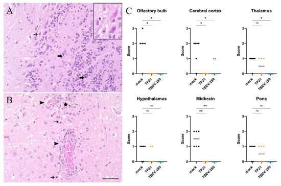 Figure 4. Assessment of neuronal damage in brain following TBEV-Hypr challenge. Representative images of HE staining from olfactory bulb (A) and thalamus (B) of mock immunized and TBEV-Hypr infected mice demonstrating neuronal necrosis (thin arrows), inflammation (arrow heads), cellular debris/pyknotic nuclei (thick arrows), and gliosis (star) are shown here; scale bars 50 µm. (C) Neuronal necrosis in different regions of brain of mock (●), TP21 (♦) and TBEV-280 (▲) immunized and TBEV-Hypr infected mice (n = 6) were scored on a scale of 0–3 (see methods). Each dot represent individual mice, bars indicating mean value (* p < 0.05, ** p < 0.01, ns = not significant).