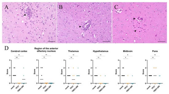 Figure 5. Inflammation in the brain. Regions with perivascular infiltrates (PVI) were assessed using HE staining. PVI (arrow heads) were not only detected in mock (A) but also in TP21 (B) and TBEV-280 (C) immunized mice that were subjected to TBEV-Hypr challenge; scale bars 50 µm. (D) High power fields from different regions of brain of mock (●), TP21 (♦) and TBEV-280 (▲) immunized mice (n = 6) were screened and the score (see methods) obtained for PVI from individual mice was plotted here. Dots representing individual animals, bars indicating mean value (* p < 0.05; ** p < 0.01, ns = not significant).