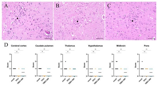 Figure 6. Reactive changes in the brain following TBEV-Hypr challenge. Gliosis (star) was detected in the brain of mock (A), TP21 (B) and TBEV-280 (C) immunized mice that were subjected to TBEV-Hypr challenge; scale bars 50 µm. (D) Gliosis was scored on a scale of 0–3 (see methods) by screening HPF from different brain regions of mock (●), TP21 (♦) and TBEV-280 (▲) immunized mice. Dots represent individual animals, bars indicates mean value (n = 6; * p < 0.05, ns = not significant).