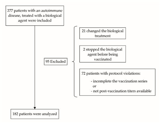 A noninterventional, multicenter, cohort study was designed to evaluate the immune response to Streptococcus pneumoniae vaccination in patients with AIID attending the Rheumatology, Dermatology or Gastroenterology services of the four University hospitals (Infanta Sofia, Madrid, Spain; Infanta Leonor Madrid, Spain; El Tajo, Madrid, Spain and Infanta Cristina, Madrid, Spain) that participated in the study. Patients that fulfilled the inclusion criteria were invited to enroll in the study. The recruitment period started in October 2014 and the follow-up period finished when the last serological test was performed, at least 4 weeks after the last vaccine was administrated. In total 277 subjects were included at the beginning of the study, 182 of which were analyzed. A flow diagram of selected patients is shown in Figure 1.