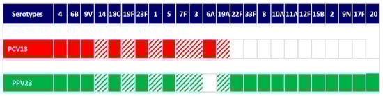 Serotypes included in PCV13 (red color) and PPV23 (green color) and serotypes evaluated for opsonophagocytosis killing assays (hatched). Nonvaccine serotypes (white color).