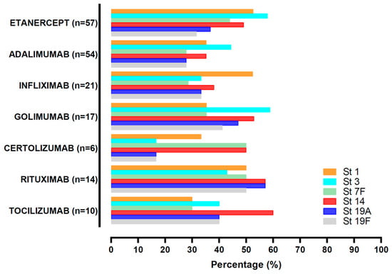 Patients with OT > 50% against each serotype, depending on the biological agent received. Abatacept and anakinra were not included due to the scarce number of patients. St (serotype), OT (opsonization titers).