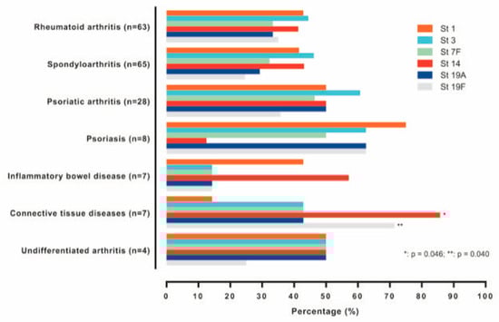 We also investigated the effect of the diagnosis in the immune response (Figure 4). We found no association between the number of serotypes with OT and diagnosis. The percentages of patients with OT against each of the serotypes studied presented not significant differences, except in the case of subjects with connective tissue diseases, which exhibited a significant higher proportion of responders to serotype 14 (p = 0.046) and serotype 19F (p = 0.040).