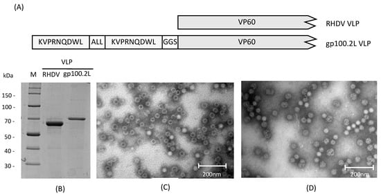 Expression and purification of virus-like particle (VLP). (A) Gene constructs used for expression of unmodified rabbit hemorrhagic disease virus (RHDV) VLP and RHDV VLP containing two gp100 epitopes (gp100.2L VLP). The 60 kDa capsid protein of RHDV is represented as VP60. Two copies of the gp100 epitope KVPRNQDWL are shown in the gp100.2L construct, along with a processing linker (ALL) and a flexible linker (GGS) at the junction between the gp100 epitopes and the VP60 sequence. (B) Ten percent SDS-PAGE of purified RHDV VLP and gp100.2L VLP stained with Coomassie Brilliant Blue G-250. (C,D) Transmission electron microscopy confirming particle assembly for RHDV and gp100.2L VLP, respectively. Upon overexpression, 180 copies of the VP60 monomer self-assemble into icosahedral capsids of approximately 40 nm in size.