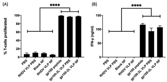 In vitro T-cell proliferation and cytokine response towards VLP-loaded nanofibers. BMDCs Cells were pulsed with 1 µg of VLP in PBS, 1 µg of VLP from a nanofiber, or gp100 peptide at a molar equivalent to gp100 in 1 µg of VLP. T-cells were co-cultured with pulsed bone marrow-derived dendritic cells (BMDCs) for 72 h. (A) T cell proliferation determined by flow cytometry and (B) IFN-γ production results determined by ELISA of the supernatant. Each bar represents the mean percentage of T-cell proliferation (±SEM). The data represents 3 independent experiments. Statistical significance was determined by a one-way ANOVA with Dunnett’s multiple comparisons test. **** p < 0 0001. Statistical significance displayed is the comparison of RHDV VLP nanofiber against negative control groups. The gating strategy used to generate this data is shown in Supplementary Figure S2.