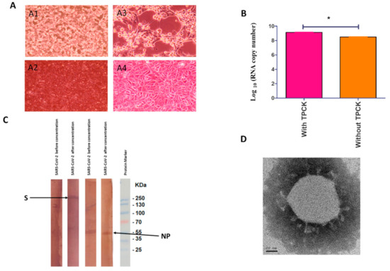 (A) Cytopathic effect of SARS-CoV-2 infection on African Green Monkey kidney cells (Vero-E6); (A1). Infected Vero cells on day 4 post infection with magnification 10×; (A2) infected cells at 40× magnification. A3 and A4 are Vero-E6 cells infected with the inactivated vaccine at magnification 10× and 40×, respectively. (B) RNA copy numbers of cultivated virus with and without TPCK-treated trypsin. The significant differences are indicated (* = p < 0.05). (C) Western blot protein profiles of cultivated viruses before and after concentration. Immunogenic peptides S and NP were characterized at about 270 and 55 kilodalton (kDa), respectively. (D) Electron microscope image of cultivated SARS-CoV-2 virus.