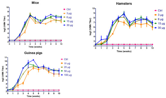 Follow up of virus microneutralization (VMN) antibody titers in vaccinated mice, hamsters, and guinea pigs using different vaccine doses. (Ctrl: control).