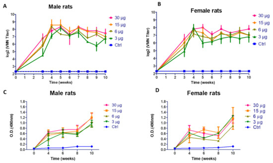 At 3 to 10 wpv, vaccinated animals (males and females) showed a highly significant immunological response compared with the non-vaccinated group in a dose-dependent fashion. Slight fluctuation of VMN titers (p > 0.05) was observed in both vaccinated male and female rats (Figure 3A,B). The elicited IgG antibody response of male rats as illustrated in Figure 3C showed a highly significant (p < 0.001) increase in O.D reading in comparison with the control group at 4, 6, 8, and 10 wpv. Vaccinated female rats showed an incremental increase in antibody response (p < 0.05) at 4, 6, and 8 wpv and a highly significant increase in O.D reading at 10 wpv (p < 0.001), as shown in Figure 3D. At doses 15 and 30 µg, the male and female rats showed an elevated immune response in comparison with the 3 and 6 µg/dose of immunized rats.