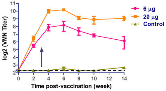 Virus microneutralization (VMN) antibody titers in prime-boost vaccinated mice. Arrow indicates booster immunization.