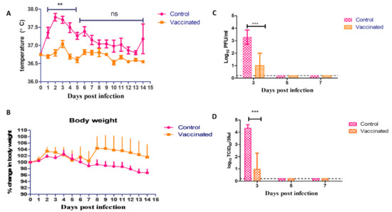 (A) Rectal temperature of challenged vaccinated and control hamsters; (B) Body weights of challenged vaccinated and control hamsters; (C) Viral shedding through nasal washes measured by plaque titration of challenged vaccinated and control hamsters; (D) Viral shedding through nasal washes measured by TCID50 of challenged vaccinated and control hamsters. The significant differences are indicated (** = p < 0.01, *** = p < 0.001 and non-significant = ns).
