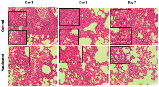 There were no remarkable histopathological differences in all assessed organs observed between all groups before the challenge test. However, following challenge, the lungs of the control unvaccinated group revealed chronic interstitial inflammatory cells in the dissecting muscle wall in most sections, with hyperplastic alveolar lining and chronic bronchitis. These changes deteriorated with time to be more marked in the tissues collected on day 7. On the other hand, the lungs of the vaccinated animals challenged with the virus showed mild histopathological changes compared to the unvaccinated animals at the respective time points. This was in the form of decreased alveolar changes and severity of inflammation. Interestingly, these mild histopathological alterations improved on day 7 (Figure 6). On the other hand, no marked histopathological change was observed in liver and renal tissues of both vaccinated and non-vaccinated groups at the three time points, i.e., 3, 5, and 7 days post challenge.
