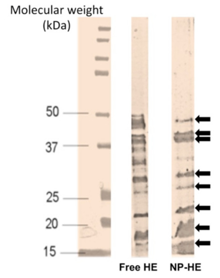 HE-loaded nanoparticles (NP-HE) presented an average size of about 430 nm with a negative zeta potential of −31 mV. The protein loading was calculated to be 24.1 µg/mg polymer, with an encapsulation efficiency of 72.3%. The encapsulation processes had no effect on the integrity of the main HE proteins; among them, the major well-characterized antigenic proteins had the molecular weights of 46.3, 43.5, 41.7, 32.7, 29, 22, 17, and 14.5 kDa (Figure 1).