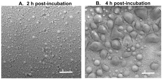 We next compared the stability of NP-HE in the tap water of Pamplona, Spain, and two aqueous solutions with the hardness of 30 °fH and pH of either pH 5.5 or 8.5, respectively, according to the protocol previously described in the methods section. In all cases, NP-HE, independent of the pH and hardness conditions, demonstrated high stability for at least two hours post-incubation in the corresponding solutions. On the contrary, after two hours of incubation in the aqueous media, the nanoparticle dispersions’ turbidity decreased. This decrease was higher when nanoparticles were dispersed in alkaline pH conditions than in acidic ones (Table 1). Thus, the half-life (t ½) of nanoparticles dispersed in water at pH 5.5 was 1 h longer than when dispersed in an aqueous medium at pH 8.5. On the other hand, our results showed that the nanoparticle stability was not affected by a high concentration of divalent cations (calcium or magnesium) (Table 1). This degradation of nanoparticles in an aqueous environment appeared to be mediated by a swelling process, as evidenced by SEM analysis of nanoparticles’ suspensions after four incubation hours in the aqueous media. The polymer Gantrez AN is insoluble in water. However, in an aqueous environment, the anhydride residues would be hydrated and transformed into carboxylic acid groups. In an aqueous environment, particularly under basic conditions, these carboxylic groups would be ionized (negatively charged), inducing a repulsion phenomenon between neighboring carboxylic groups and then facilitating the swelling of nanoparticles [27,28].