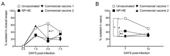 Experimental NP-HE reduces Salmonella excretion in hens. Groups of 28 hens were used to compare the efficacy of NP-HE, the inactivated commercial vaccine 1, and the attenuated commercial vaccine 2 against experimental infection with SELA5. Percentages of Salmonella-positive samples isolated from cloacal swabs (A), ceca (B), livers (C), and spleens (D). The percentages of isolation of Salmonella Enteritidis in swabs and tissues among the different experimental groups were compared by χ2 test. *, #, and T, p < 0.05 for unvaccinated vs. rest of groups.