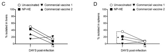Infections by Salmonella Enteritidis are asymptomatic in immunocompetent hens. The vaccination with commercial vaccine 1, and with the experimental NP-HE resulted in reductions of Salmonella excretions (determined in cloacal swabs) through the entire length of the experiment. The vaccination with commercial vaccine 2 also reduced the bacterial excretion but only after day 3 post-infection (Figure 3A). We next compared the percentages of Salmonella-positive tissues (ceca, spleen, and livers) isolated from the vaccinated and unvaccinated hens (Figure 3B–D). Overall, we observed a trend of reducing the percentages of Salmonella-positive tissues in all tissues isolated from all experimental groups compared with unvaccinated controls. However, the reduction observed was statistically significant only in the ceca of hens administered with the commercial vaccines and in the spleens of hens vaccinated with the commercial vaccine 1, on day 7 post-infection.