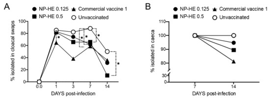 We next compared the dose-dependent efficacy of NP-HE with the efficacy of the commercial vaccine-1 and unvaccinated hens (Figure 4). Again, 28 hens per experimental group were used. The immunization with the commercial vaccine 1 resulted in a significant reduction in the bacterial excretion on days 1, 3, and 7 post-infection when compared with unvaccinated hens, determined by the bacteriological analysis of the cloacal swabs (Figure 4A). The swabs from hens that received NP-HE (0.125 mg) showed a significant reduction in Salmonella excretion on day 7. In comparison, the vaccination with 0.5 mg of NP-HE resulted in significant reductions in excretions on days 7 and 14 compared with the unvaccinated group (Figure 4A). The colonization studies performed in ceca and liver and spleen did not show significant reductions in Salmonella-positive tissue percentages. Nevertheless, we observed dose-dependent reductions in the livers and spleens of hens vaccinated with one of the two doses of NP-HE at the end of the experiment (day 14) (Figure 4B,C). In summary, the oral vaccination of 6-week-old SPF hens with the inactivated commercial vaccine 1 was successful in reducing Salmonella excretion on days 1, 3, and 7 post-infection. We also observed a significant reduction of Salmonella excretion in hens vaccinated with the experimental NP-HE in a dose-dependent manner. The protection of NP-HE appears to be delayed when compared with the commercial vaccine 1.