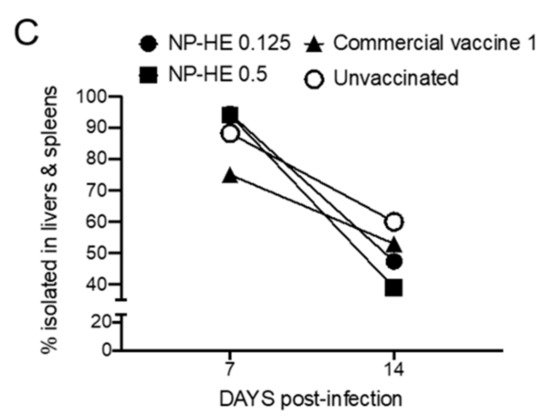The animals were monitored for two weeks. We performed a bacteriological analysis of cloacal swabs and the cecum, liver, and spleen from each hen to determine the samples’ percentages of Salmonella-positivity. We compared our vaccine candidate’s protective effects with two commercially available vaccines, the inactivated commercial vaccine 1 and the attenuated commercial vaccine 2. Our results indicate that NP-HE significantly reduced the excretion of S. Enteritidis LA5 in hens in an unknown mechanism that appears to be dose-dependent (Figure 3 and Figure 4). We also observed that the percentages of internal organs of the hens vaccinated with NP-HE positive for S. Enteritidis cultures were reduced two weeks after infection. Although no statistical significance was observed in most of the tissues analyzed, the reductions in positive cultures in tissues, and importantly, the significant reduction in bacterial excretion after vaccination with NP-HE suggest that HE nanoparticles could be a novel approach to controlling Salmonella spreading in farms. In our protection studies, we used 28 hens per group. More, larger studies are needed in order to determine the appropriate dosing strategy for NP-HE vaccinations.