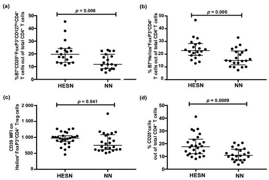 Expression of regulatory T cell populations in PBMC samples from HESN and NN women as assessed by flow cytometry. (a) Relative proportion of B7+CD25hiFoxP3+CD127lowCD4+ T cells out of total CD4+ T cells. (b) Relative proportion of B7+ Helios+ FoxP3+CD4+ T cells out of total CD4+ T cells. (c) MFI of CD39 on Helios+FoxP3+CD4+ T cells. (d) Expression of CD25 on CD4+ T cells. Data are presented as median and interquartile range. Data were analyzed with the Mann–Whitney U test and p-values < 0.05 were considered significant. Treg: regulatory T cells; FoxP3: Forkhead box P3; MFI: mean fluorescence intensity.