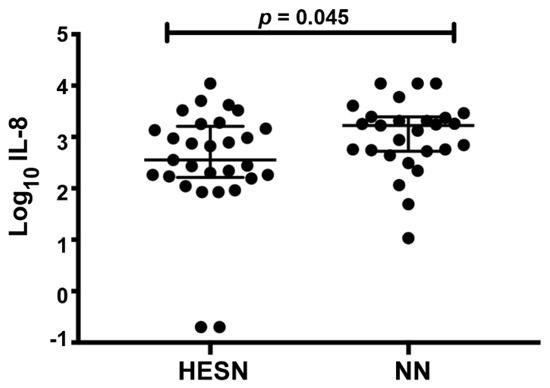 Cytokine measurement in CVL of HESN and NN study subjects. Expression of IL-8 (Log10 of pg/mL) with data presented as median and interquartile range. Data were analyzed with the Mann–Whitney U test and p-values < 0.05 were considered significant. CVL: cervicovaginal lavage.