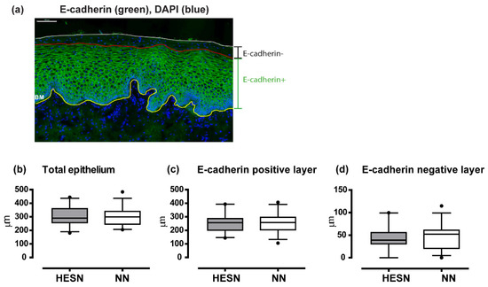 Immunofluorescence staining for E-cadherin was used to visualize and quantify epithelial thickness. The epithelial thickness of the total, E-cadherin+ and E-cadherin− layers was identified by manually drawn lines to indicate the basal membrane as well as the E-cadherin+ and E-cadherin− layers of the ectocervical epithelium (Figure 5a). The average epithelial tissue areas analyzed at the first sample time point were similar between the study subjects (HESN: median 1.5 mm2, range 0.5–2.9; NN: median 1.6 mm2, range 0.5–2.7, p > 0.05). The thickness of the total (HESN: median 290 µm, IQ range 257–360; NN: median 299 µm, IQ range 246–340), as well as of the E-cadherin+ (HESN: median 257 µm, IQ range 202–287; NN: median 258, IQ range 203–296) and E-cadherin− layers (HESN: median 39 µm, IQ range 31–56; NN: median 51 µm, IQ range 21–61), was also comparable (p > 0.05) (Figure 5b–d).