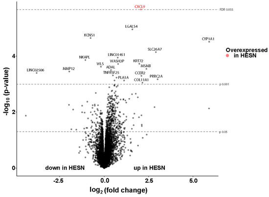 RNA sequencing was performed on RNAlater-preserved tissue samples from the second sample time point. Demographic parameters were similar in the two groups despite two additional samples from the HESN group and one from the NN group at this second sample time point as described above (Section 3.6). All ectocervical biopsies displayed good quality of isolated RNA and generated >10 million reads each. The transcriptional activity was comparable (FDR > 0.05) between the HESN and NN study groups. Of the total 15,445 genes identified by RNA-sequencing, only CXCL9 (log2 fold change 2.1, FDR adj. p = 0.03) was upregulated in the HESN group (Figure 7).