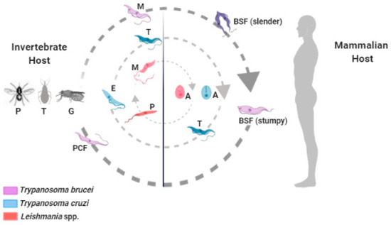 Trypanosoma cruzi, Trypanosoma brucei, and Leishmania spp. are flagellate parasites that belong to the Trypanosomatidae family and have a complex life cycle between invertebrate and mammalian hosts, where they cause Chagas disease, African trypanosomiasis, and leishmaniasis, respectively (Figure 1). These diseases mainly affect economically vulnerable populations, leading to thousands of annual deaths and major public health problems [1].