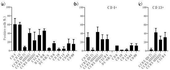 The patterns of CD4 and CCR5/CXCR4 expression in human vaginal and small intestine tissues have been described previously and compared [27,28,29,30,31,32]. However, limited phenotype characterization has been performed with colorectal tissue, known to be highly permissive to HIV-1 [22,33,34,35]. Flow cytometry analysis of enzyme-digested colorectal tissue showed, as expected, a high level of CD4+ cells (60.73 ± 13.22%) and 35.93 ± 13.02% of CXCR4+ cells (Figure 1a). Due to the presence of different conformational forms of CCR5 on the surface of HIV-1 target cells [36] we used three MAbs (2D7, 45,531 and 45,523) targeting different conformational epitopes [37] to better assess the level of CCR5 in colorectal tissue. Furthermore, these MAbs have shown no cross-reactivity in CCR5-∆32 homozygous PBMCs [24]. CCR5 was detected on the cell surface with different levels of exposure for each epitope (8.29 ± 2.04% of 2D7+ cells, 40.56 ± 9.42% of 45531+ cells and 23.66 ± 19.07% of 45523+ cells) (Figure 1a). Similarly to previous analysis performed in vaginal and small intestine tissues [29], we measured the level of different cell population markers and innate response receptors. Compared to CD4+ cells, 17.20 ± 3.95% of cells were CD8+ cells and only 3.91 ± 2.01% of CD19+ cells were found in the digested samples. However, high levels of HLA-DR (45.95 ± 4.36%) and CD13 (60.00 ± 5.19%) were expressed in this tissue. Only 5.78 ± 0.81% of cells were DC-SIGN+ and the level of expression of innate response receptors was variable with 4.57 ± 4.23% of CD14+ cells, 16.73 ± 9.96% of CD64+ cells and 15.47 ± 10.62% of CD89+ cells. (Figure 1a). The expression of these receptors, as well as CCR5 and CXCR4, was similar to the levels detected within the CD4+ population (Figure 1b). Interestingly, 31.51 ± 10.08% of CD4+ cells were CD13+ (Figure 1b). In contrast to previous reports were CD13+ cells of small intestine did not express HIV-1 coreceptors [29], CD13+ cells isolated from colorectal tissue expressed CCR5 (3.21 ± 2.92% of 2D7+ cells, 42.54 ± 9.39% of 45531+ cells and 25.79 ± 8.05% of 45523+ cells) and CXCR4 (31.33 ± 11.35%) (Figure 1c).