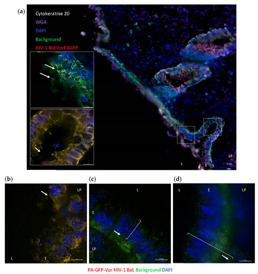 Ex vivo HIV-1 interactions with human colorectal tissue. Colorectal explants were exposed to PA-GFP-Vpr HIV-1 BaL (red and signaled with arrows) for 6 h. (a) Representative image of cryosections stained with cytokeratine 20-RedX (white) and WGA-Cy5 (purple) to label the columnar epithelium; autofluorescence is shown in green; top and bottom insets correspond to left and right boxed areas in main image, respectively. (b–d) Representative images of cryosections with autofluorescence shown in green; brackets indicate distance of virion from the tissue surface: (c) 18.6 μm and (d) 39 μm. Cell nuclei stained with DAPI (blue). White bar = 10 μm. L: lumen; E: epithelium; LP: lamina propia.